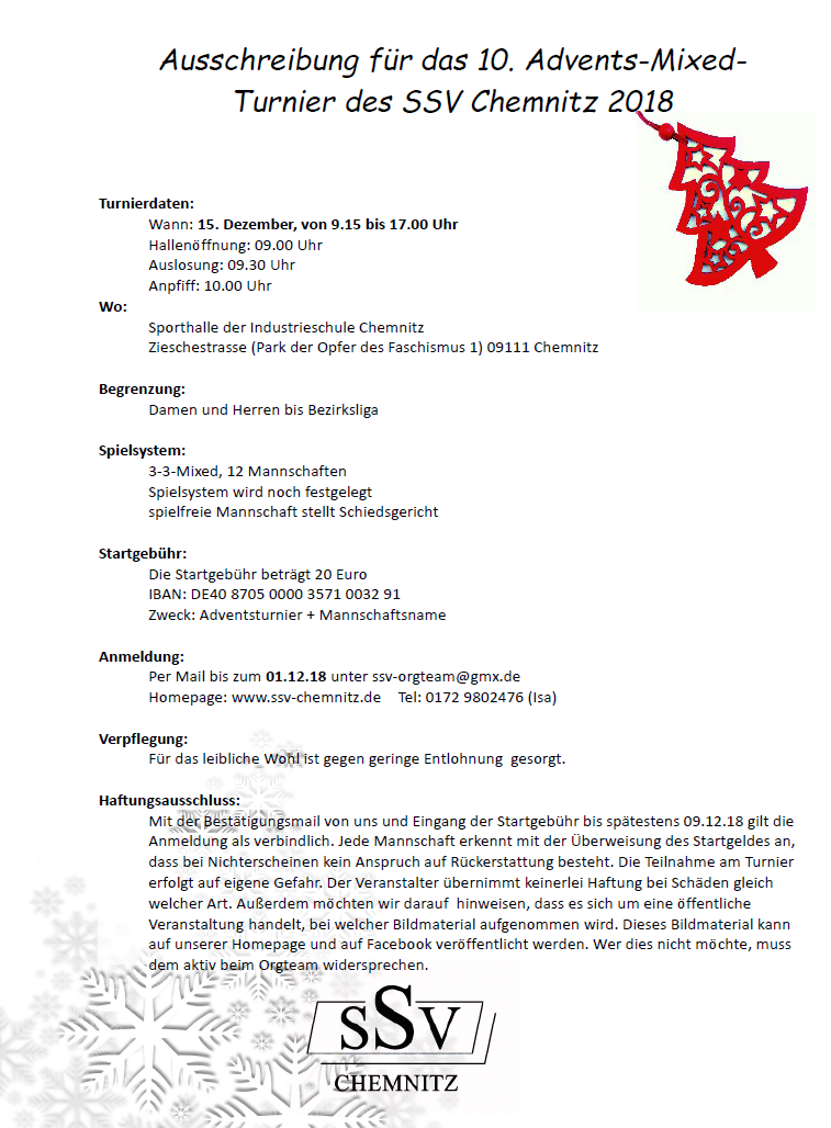 10. Jahre Advents-Mixed-Turnier des SSV Chemnitz - Seid auch dieses Jahr beim Kampf um den Pokal und tolle Preise dabei! Alles Wichtige findet ihr hier in der Auschreibung.