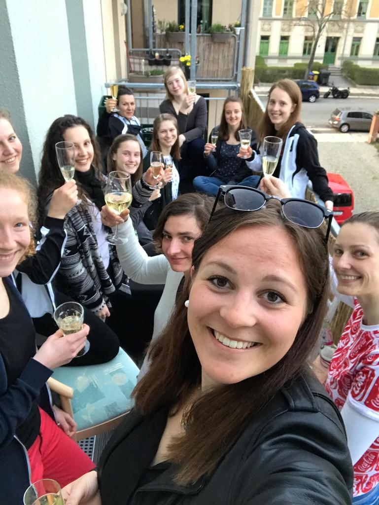 Nach dem erfolgreichen Spiel machten sich alle auf den Weg Richtung Aufstiegsparty in der großen Wohnung von Michelle und Emi L. Dort angekommen wurde direkt die 3 Liter Sektflasche professionell von Izzy geköpft und auf uns angestoßen. Es folgte Essen vom Grill und weitere Köstlichkeiten, die auf dem Balkon bei schönem Wetter von uns verspeist wurden. Im weiteren Verlauf des Abends wurden viele lustige Spiele gespielt, ausgiebige Gespräche geführt und Igel gestreichelt.