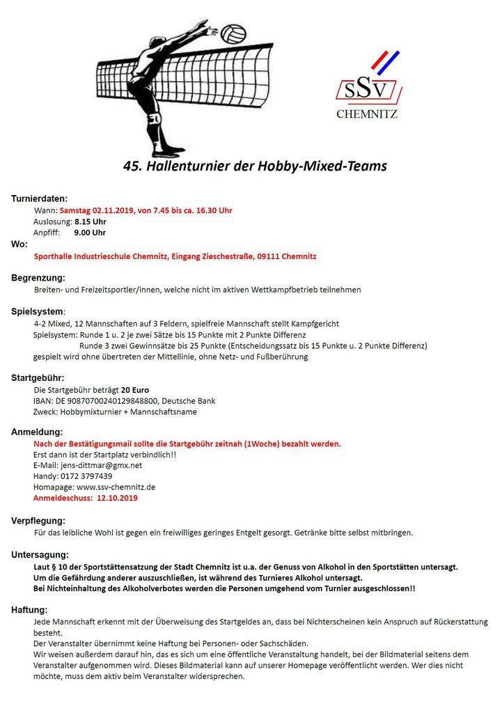 Der Sommer neigt sich dem Ende entgegen, alle sind wieder in der Halle, höchste Zeit für die Ausschreibung zur inzwischen 45. Auflage unseres Turniers für Hobby-Mixed-Mannschaften. Sucht euch fünf Mitstreiter für den 02.11.2019 und meldet euch an. Die Plätze sind traditionell schnell weg.