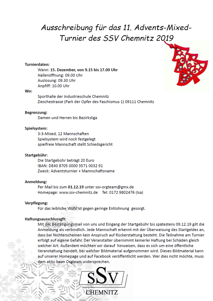 Stollen und Lebkuchen, "Last Christmas" im Radio - es geht so langsam auf Weihnachten zu. Höchste Zeit, euch zum 11. Adventsturnier des SSV einzuladen. Am 15.12.2019 ist es soweit. Alles weitere findet ihr hier in der Ausschreibung. Seid dabei, wenn kurz vor den Festtagen nochmal die Bälle fliegen.